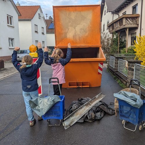 Der Bauhof hatte uns zuvor mit Greifzangen, Handschuhen, Warnwesten und Müllbeutel ausgestattet. Vor das JUZ in der Hauptstraße und in Baiertal „Am Krähberg“ wurden uns 2 Container aufgestellt, in die wir den Müll sicher entsorgen konnten. Tine Groß war zusammen mit den 4. Klassen der Pestalozzischule Baiertal unterwegs, um den Müll um die Schule herum einzusammeln. Wir finden es sehr wichtig, dass junge Menschen einen bewussten Umgang mit dem Thema Plastik und Müll lernen. Die Gemarkungsreinigung ist die Gelegenheit, sich gemeinsam mit Spaß und Freude diesem für die Zukunft wichtigen Thema anzunehmen. Mit dem „Vespergeld“, mit dem sich die Stadt bei allen Teilnehmer*innen bedankt, waren die beiden Klassen ein Eis essen.