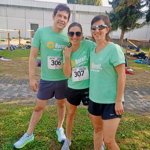 Gespannt warten wir im Zielbereich auf die beiden, um dann jeweils zu dritt die letzten Meter zum Ziel zu laufen. Geschafft!
