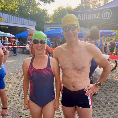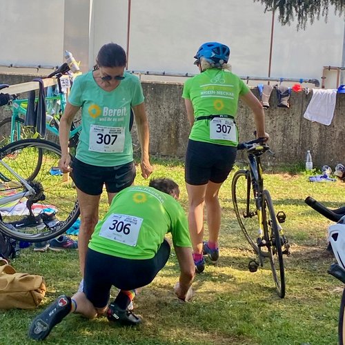 Hermino und Heike begeben sich zu den Rädern, um sich ein bisschen warm zu fahren, aber allzu viel Zeit bleibt nicht, da um kurz nach 9 Uhr der Startschuss fällt und unsere Schwimmer wahrlich nicht zu den Langsamsten gehören! Marion hat dieses Jahr ein bisschen die Nase vorn, aber beide, sie und Stefan, treffen fast zeitgleich bei uns in der Wechselzone ein. Dank Gabis Orga klappt der Wechsel der Transponder problemlos und Heike begibt sich als Erste auf die Radstrecke, wird aber schon kurz darauf von Hermino überholt. Die Strecke geht 22 km von Eberbach über Pleutersbach, Allemühl und Schönbrunn zum Wendepunkt nach Schwanheim und wieder zurück. 310 Höhenmeter sind dabei zu überwinden. Zum Glück findet der Wettkampf so früh statt, aber dennoch ist es schon drückend heiß. Umso willkommener ist dann der Fahrtwind, wenn es das Tal wieder zurück nach Eberbach geht. Hermino hat Heike ganze 6 Minuten abgenommen, puuh, hat der Mann ein Tempo drauf! Aber auch Heike kommt wohlbehalten in der Wechselzone an, wo ein letzter schneller Wechsel des Transponders stattfindet, sodass Gabi sich auf die Laufstrecke von 6 km entlang des Neckars begeben kann. Jürgen ist entsprechend eher losgestürmt.