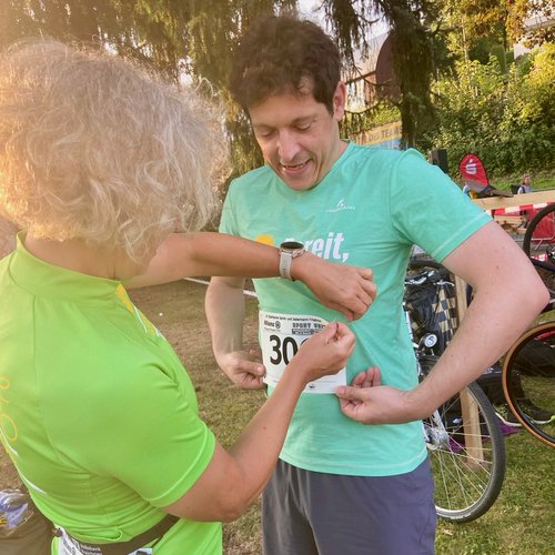 Es war also klar, dass wir alles geben müssen. Hermino, Stefan und Heike reisten aus Neckargemünd per S-Bahn an und holten gleich die Startunterlagen. Kurz darauf treffen die Wieslocher, Marion, Gabi und Jürgen, ein. Nach herzlicher Begrüßung (Mensch, wie schnell doch so 2 Jahre vergehen) richten wir uns in der Wechselzone ein, platzieren die Bikes von Hermino und Heike und sortieren uns erst einmal. Gabi übernimmt hier gleich die Orga und teilt ein, wer wem beim Transponderwechsel hilft, damit kein hektisches Gewusel entsteht, das wertvolle Sekunden kosten könnte. Der Transponder ist ein kleines Messgerät, das das Überschreiten der Start- und Ziellinie registriert und dem Veranstalter sendet. Schummeln ist also ausgeschlossen. Wir befestigen den Läufern und Radlern ihre Startnummern an den Green-Team-Shirts und kurz darauf ist es schon Zeit, zur Wettkampfbesprechung zu gehen. Es wird allen Teilnehmer*innenalles Wissenswerte zum Wettkampf erläutert, wie der Ablauf ist, wann das Schiff ablegt, um die Schwimmer*innen 700 m flussaufwärts zum Start zu bringen, dass ein Neoprenanzugverbot gilt, da der Neckar die 22 Grad überschritten hat, dass die Radler*innen sich trotz Straßensperrung an die StVO zu halten haben (anscheinend gibt es Spezialisten, die den Kreisel bei Schönbrunn links herum fahren, um Zeit zu sparen...) und dass alle bitte aufeinander achten mögen, damit auch alle gesund ins Ziel gelangen. Die Nervosität steigt, aber es hilft nichts. Unsere beiden Schwimmer, Marion für unsere Mädels-Staffel, und Stefan für die Jungs-Staffel, verabschieden sich und gehen zum Ponton-Schiff, das gleich ablegen wird.