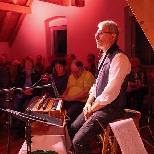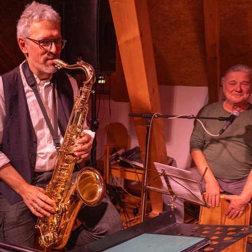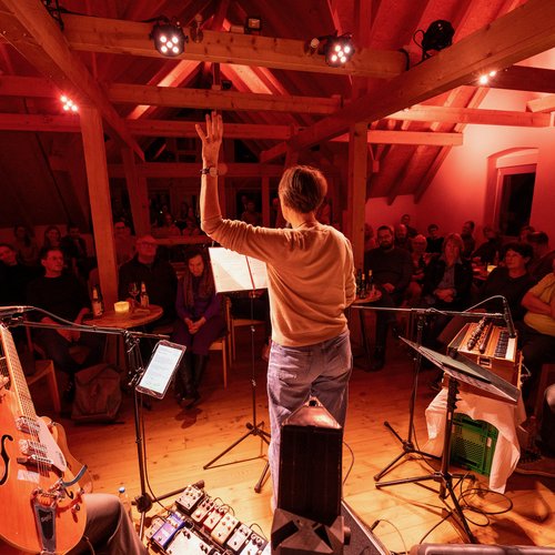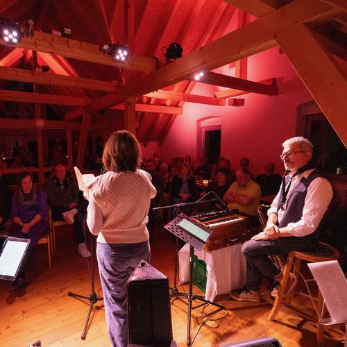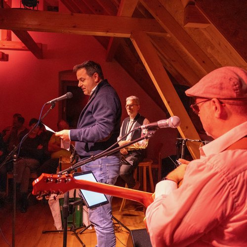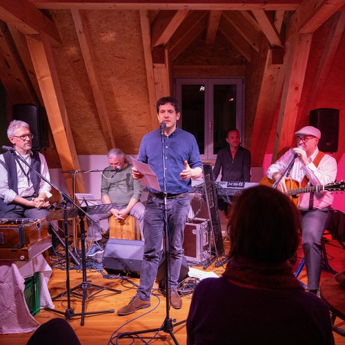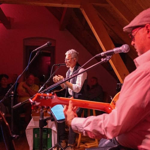 Die Veranstalter des Wieslocher Ortsverbands von BÜNDNIS 90/DIE GRÜNEN hatten nicht zu viel versprochen. Trotz des großen Andrangs und der entsprechenden Enge „unterm Gebälk“ im Dorfgemeinschaftshaus HoHa7 herrschte bei den Lieblingsliedern der „KleinRaumBand“ – bestehend aus Peter Neubauer und Martin Dietrich, verstärkt durch Tom Pfeifer und Bastian Rössler – eine Atmosphäre von Gemütlichkeit und Zuversicht.