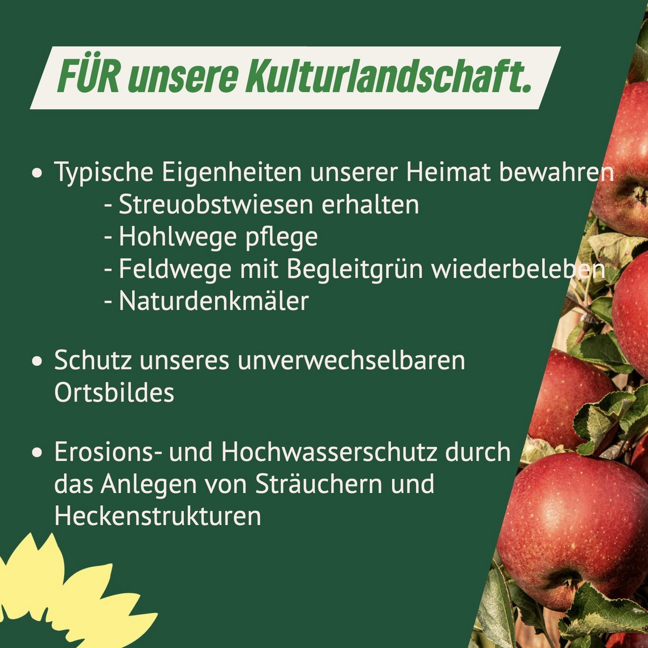 Unsere Kulturlandschaft ist das Ergebnis der Wechselwirkung zwischen natürlichen Elementen wie Gelände, Klima und Boden sowie den Aktivitäten und Entscheidungen der Schatthäuser*innen im Laufe der Jahrhunderte. Sie spiegelt die kulturelle, historische und ökonomische Entwicklung unserer Ortschaft wieder und ist durch eine Vielzahl von Merkmalen gekennzeichnet: Hohlwege, Streuobstwiesen, Naturdenkmäler, wie z. B. der ehemalige Steinbruch, sind lebendige Zeugen dieser Entwicklung. Feldwege mit ihrem Begleitgrün als lebendiges Netzwerk sind Archen der Artenvielfalt. Was von Generationen vor uns geschaffen und gepflegt wurde, gestalten wir behutsam weiter und bewahren es für die kommenden Generationen.