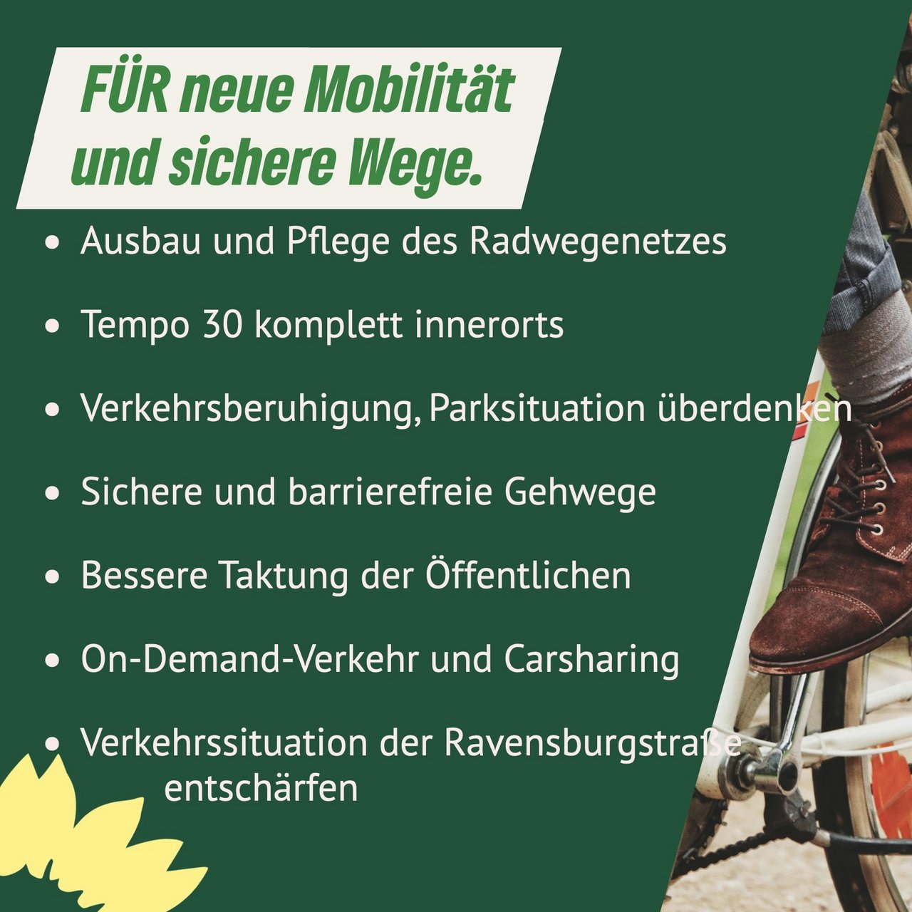 Die Ravensburgstraße ist eine stark befahrene Straße die den Anwohnern mit Verkehrslärm und Luftverschmutzung zu schaffen macht. Mit Tempo 30 von Ortsschild zu Ortsschild und weiteren verkehrsberuhigenden und kontrollierenden Maßnahmen würden diese Belastungen erheblich sinken und die Straße für Anwohner lebenswerter und sicherer werden. Die Gehwege sind an einigen Stellen zu schmal oder fallen steil zur Straße hin ab, so daß ein Befahren mit Kinderwagen, Rollator oder Rollstuhl nicht sicher möglich ist. Wir engagieren uns für eine Überprüfung der Gehwege und Straßenquerungen.