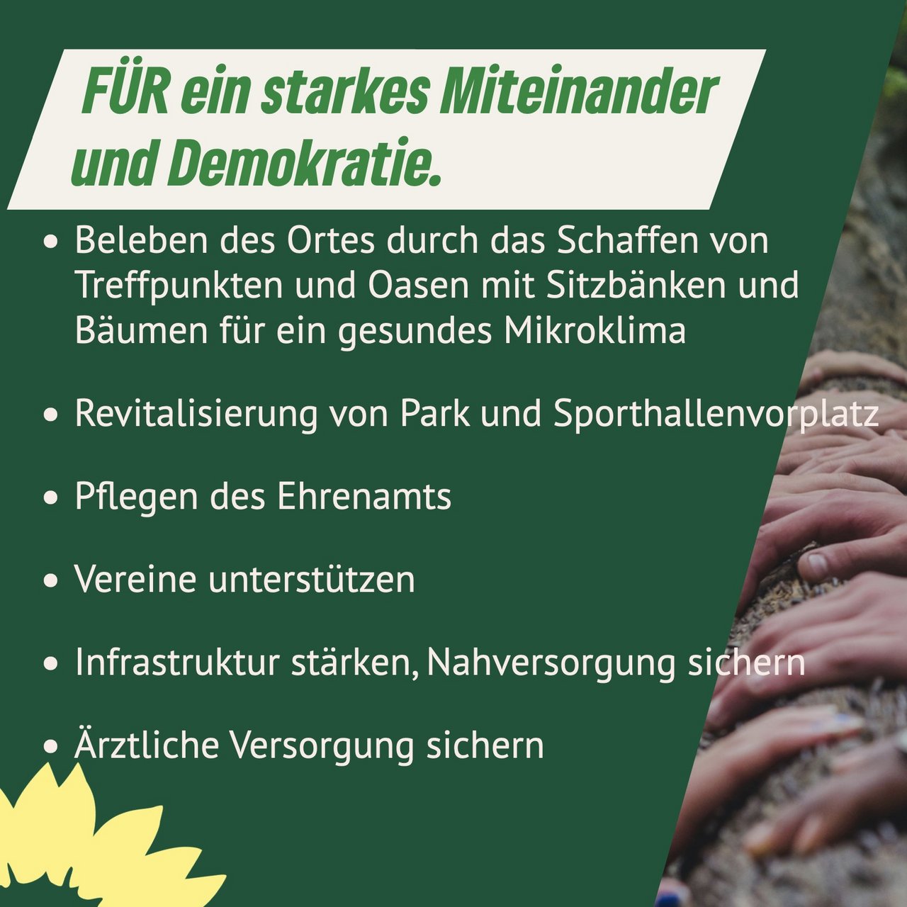 Nix wie raus! Ich wünsche mir für alle Ortsteile Wieslochs lebendige Plätze mit Bänken und Treffpunkten die das soziale Miteinander fördern. Menschen brauchen die Möglichkeit, sich auch außerhalb des Internets zu treffen. Hinein ins echte Leben! Unsere wertvolle Kulturlandschaft mit Streuobstwiesen, Hohlwegen und naturnahen Bächen lädt dazu ein. Lasst sie uns schützen und erhalten. Besonders Kinder brauchen Abenteuer, die sie draußen erleben können. Sie sind die Erwachsenen von morgen, unsere Zukunft. Wir benötigen Kindergärten mit geeigneten Räumlichkeiten, Außenanlagen und genügend Platz, um unseren Kindern und Enkeln den bestmöglichen Start ins Leben zu bieten. Das Rad- und Fußwegenetz Wieslochs sollte besonders zwischen und in den Ortsteilen optimiert werden. Die Sicherung von Fuß-, Rad- und Gehwegen ist besonders entlang stark befahrener Straßen notwendig.