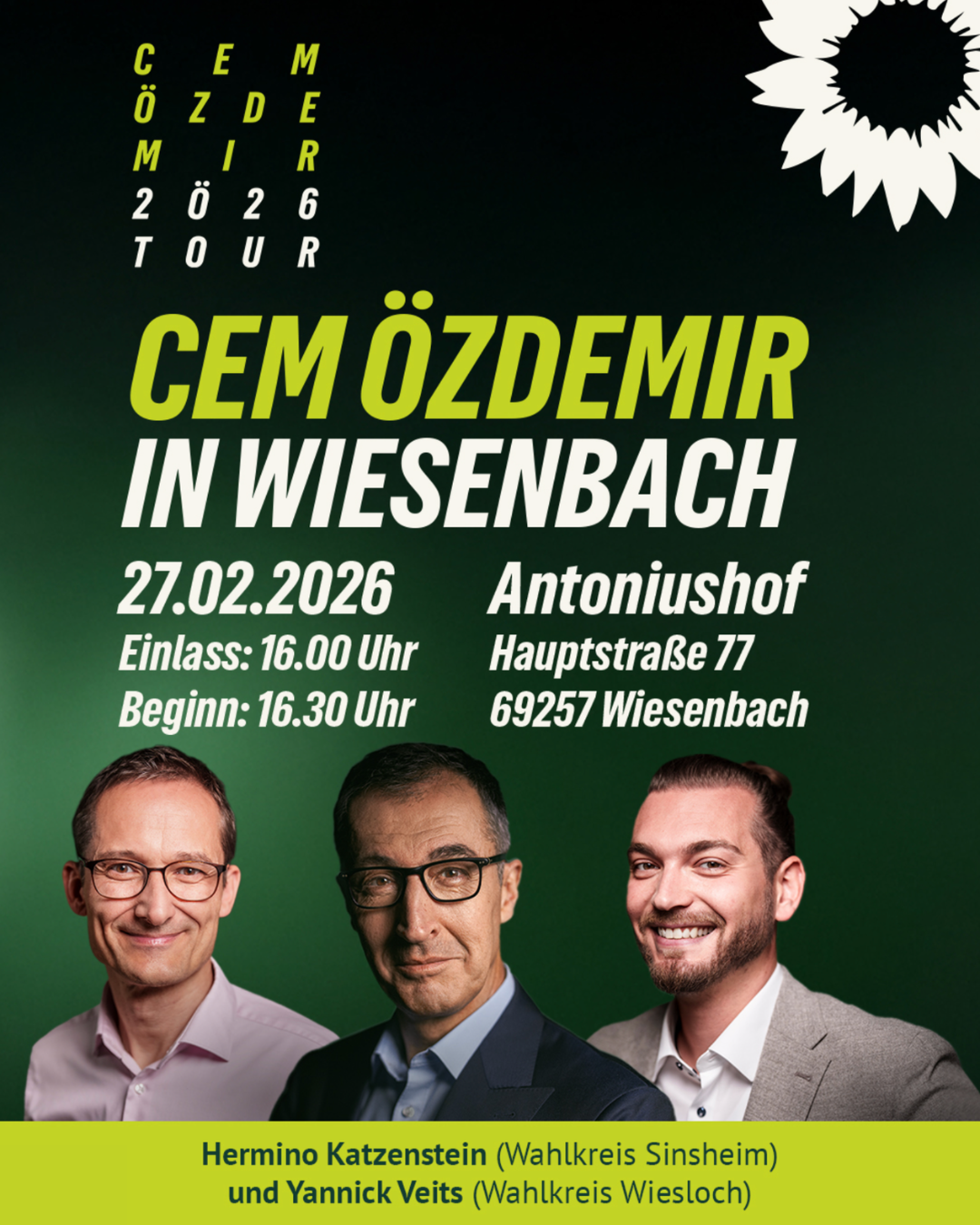 Am Donnerstag, den 27. Februar 2026, um 16:30 Uhr (Einlass ab 16:00 Uhr) macht Cem Özdemir im Rahmen seiner 2Ö26-Tour Station in Wiesenbach. Gemeinsam mit unseren Landtagskandidaten Yannick Veits (Wahlkreis Wiesloch) und Hermino Katzenstein (Wahlkreis Sinsheim) diskutiert er über die Themen, die uns alle bewegen – von der Wirtschaftüber Bildung bis hin zu einer starken Demokratie.
